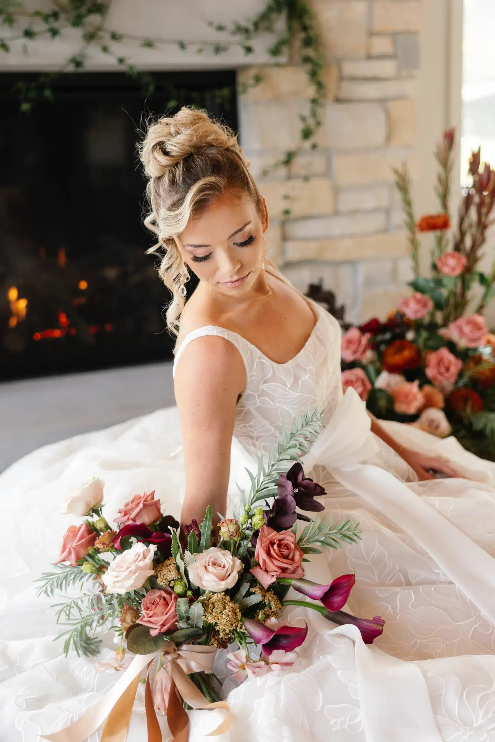 Belle Fiori, Ltd.’s designs brought a cohesive, natural feel to the entire shoot, connecting the outdoor setting with the interior of the lodge. From the bouquets to the fireplace installation and statement cape, every detail worked together to create a warm, inviting look that inspires any upcoming wedding and event.