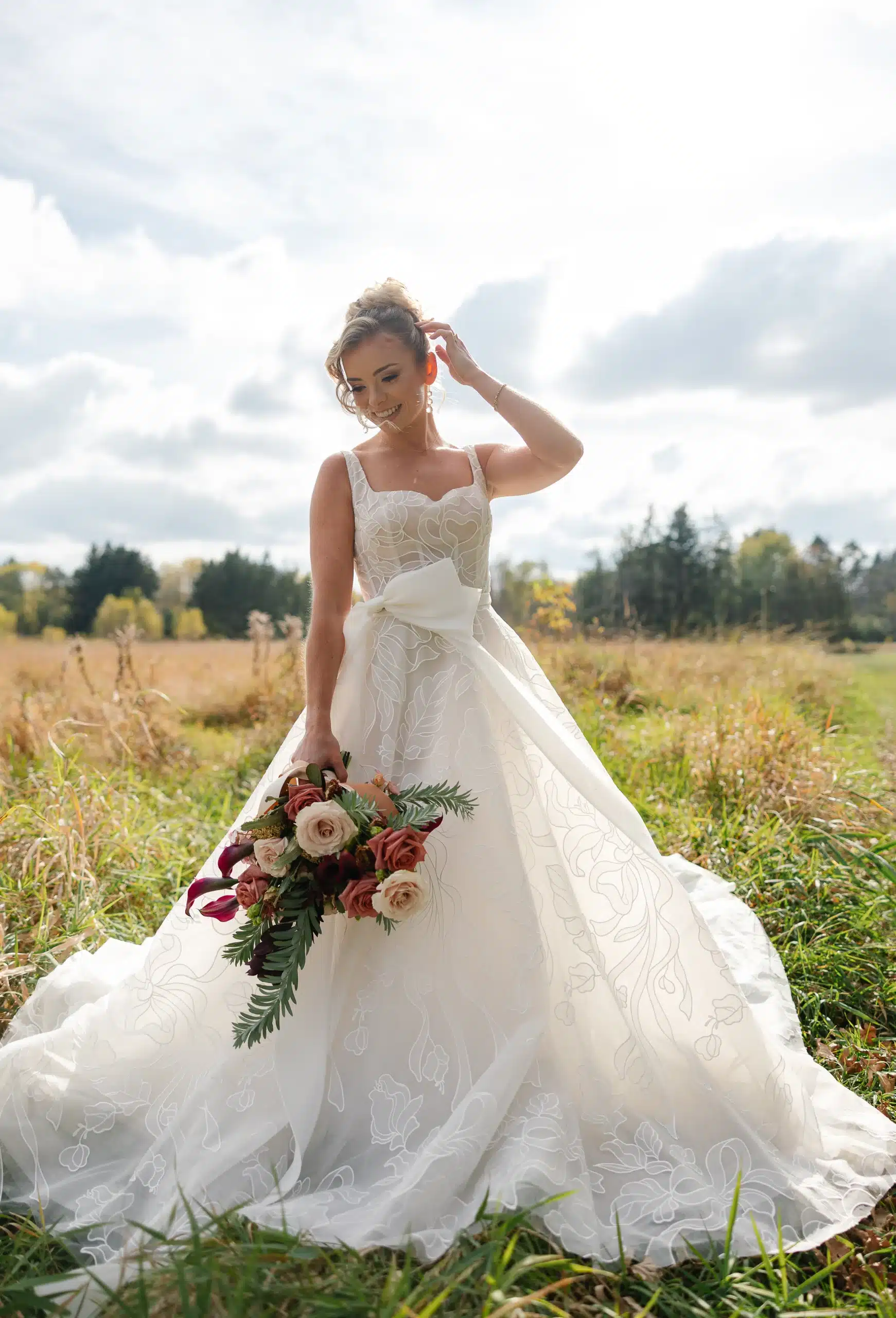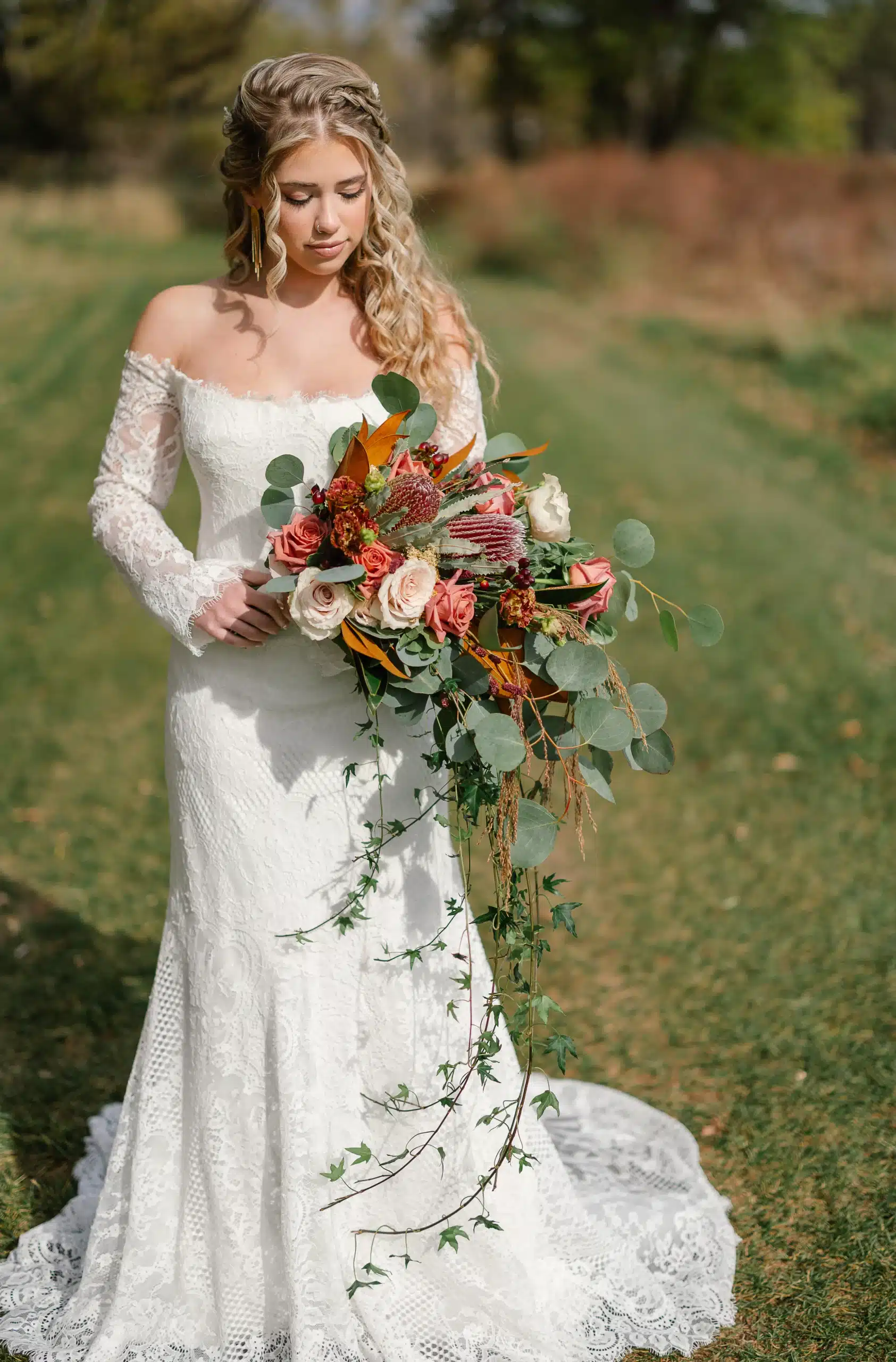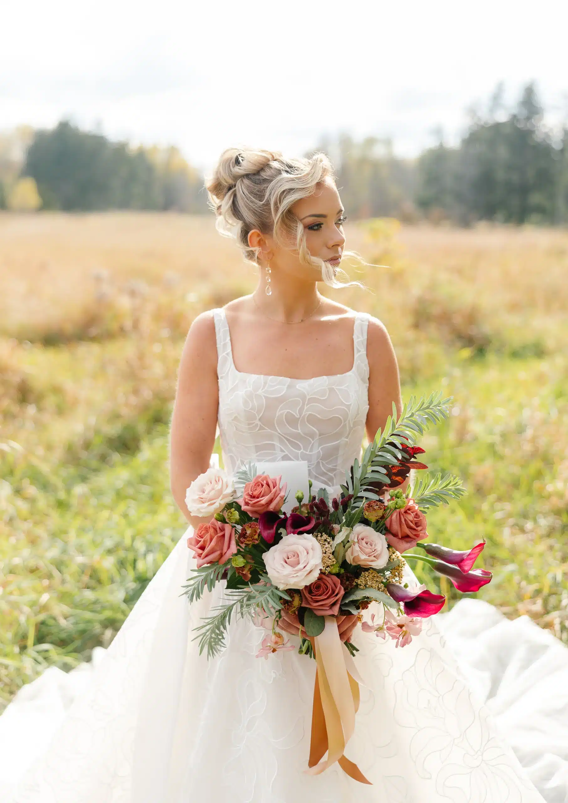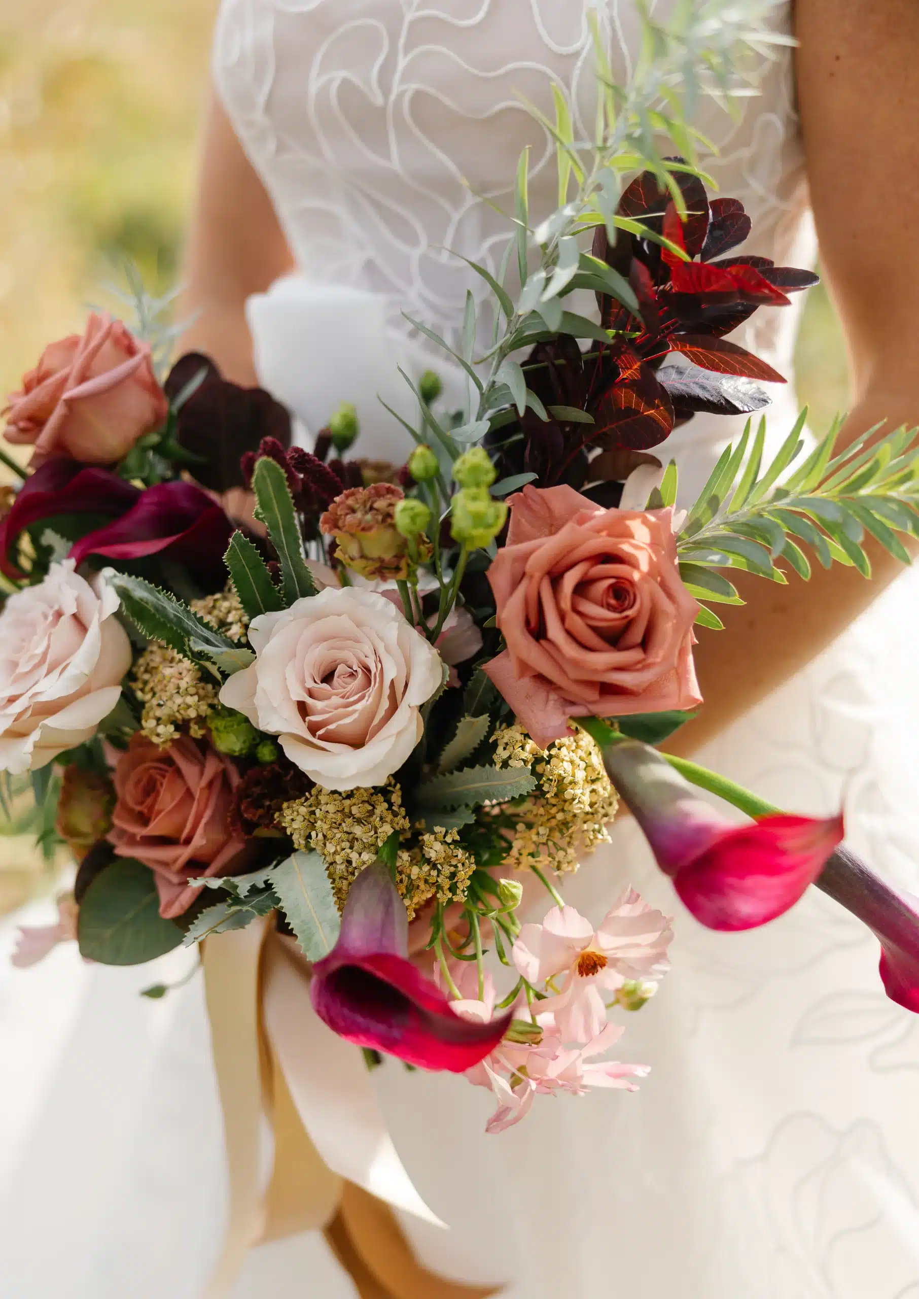 Belle Fiori’s florals felt organic and textured, perfectly complementing the natural surroundings of Lapham Peak. The bouquets featured soft neutrals mixed with deeper tones, layered with eucalyptus, trailing greenery, and unexpected elements for movement and depth. The result was a look that felt both romantic and a little untamed—effortless, but still elevated.