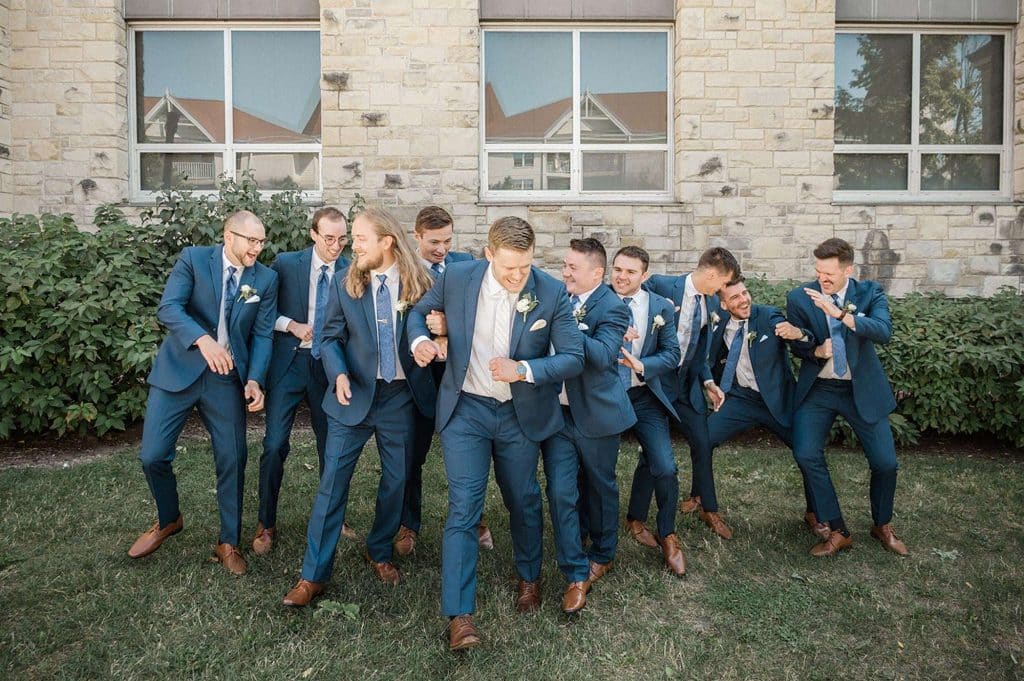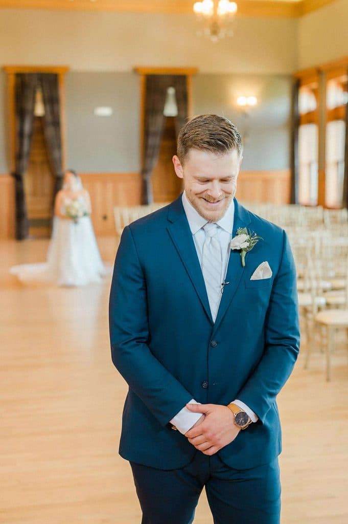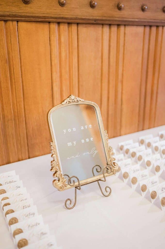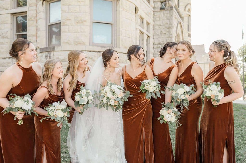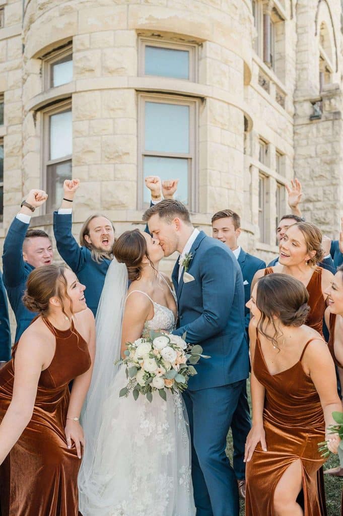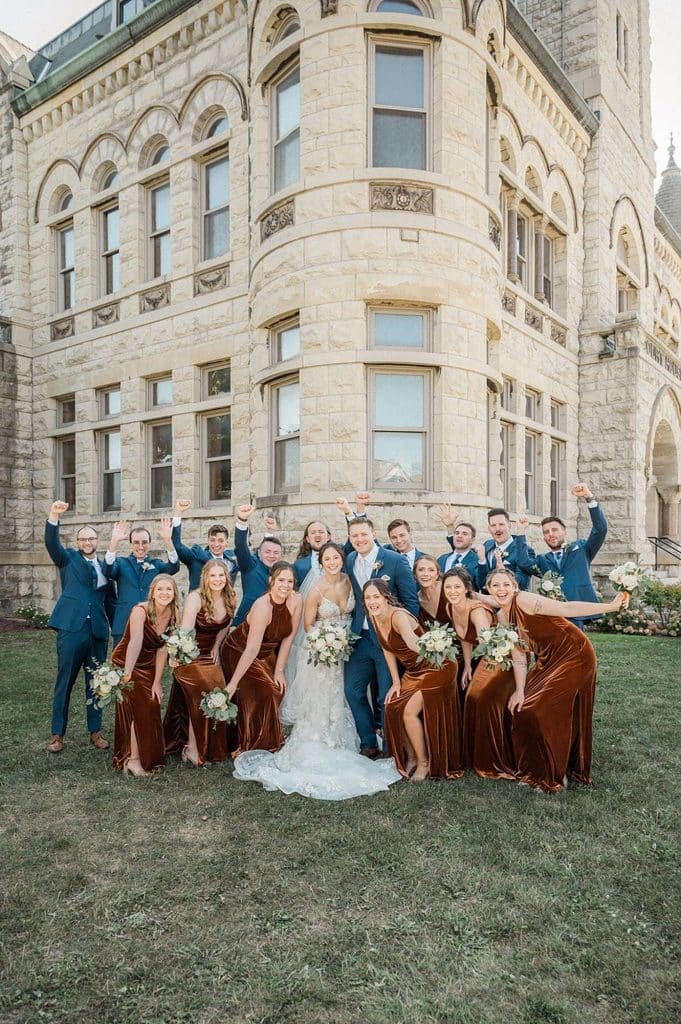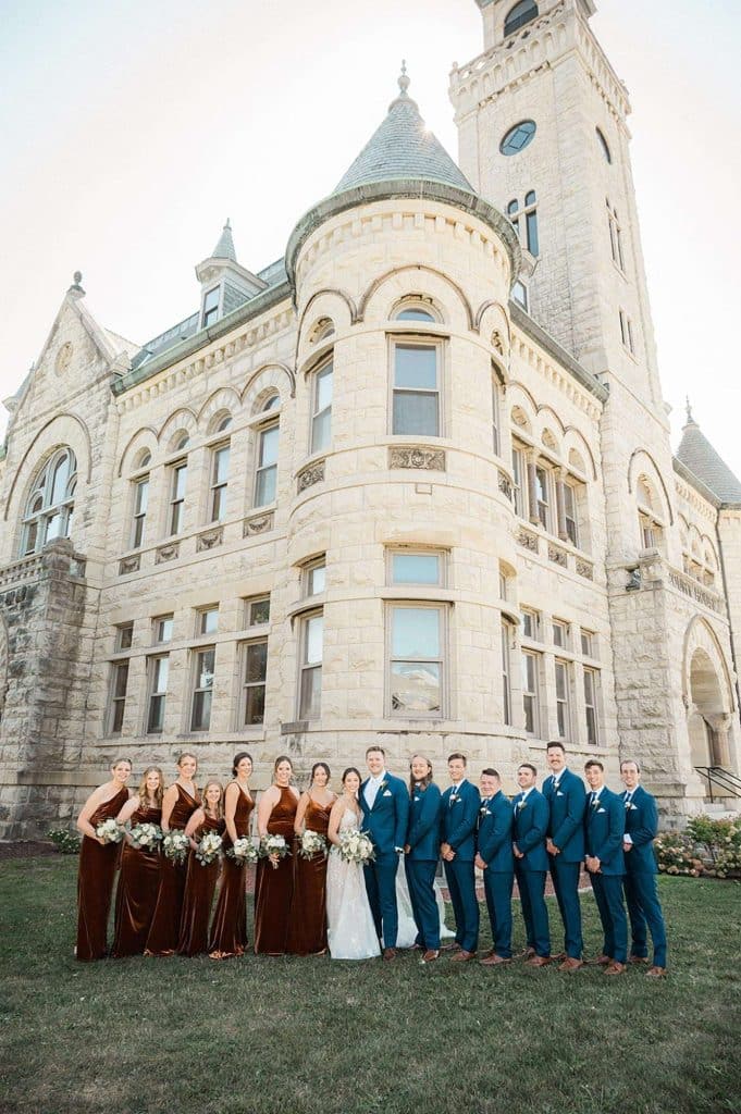 The color palette of Delaney and Alex’s wedding consisted of rust orange, navy blue, and gold. The venue was adorned with stunning floral arrangements from Belle Fiori.