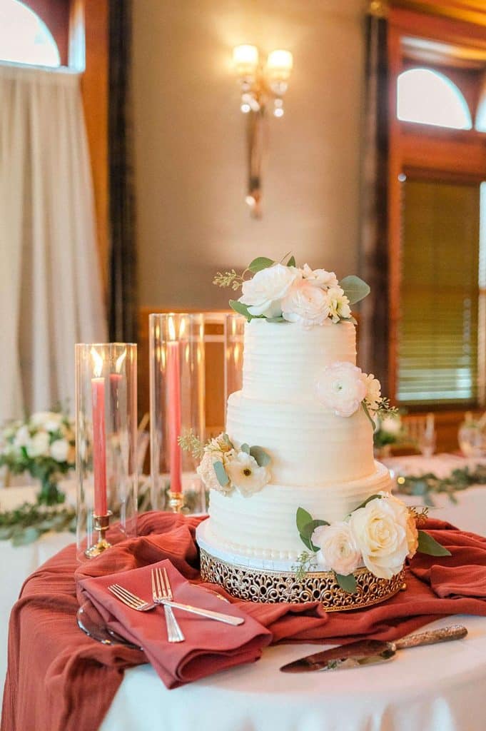 The wedding menu was cooked and catered by Chef Jack’s. Guests enjoyed chicken en croute and mushroom filet mignon with garlic mashed potatoes and roasted veggies. Appetizers included grilled cheese and tomato shooters and barbecue chicken quesadillas. The wedding cake from Sally’s Sweet Shoppe was a carrot cake with cream cheese frosting. Dessert also included a chocolate liqueur shot in a chocolate shot glass.