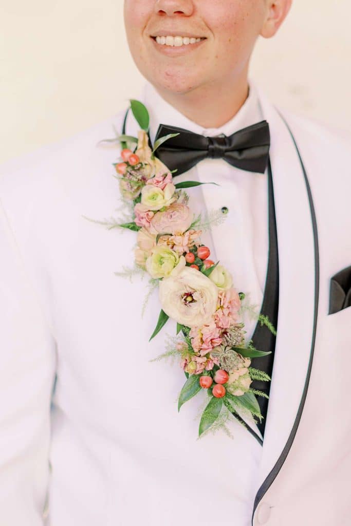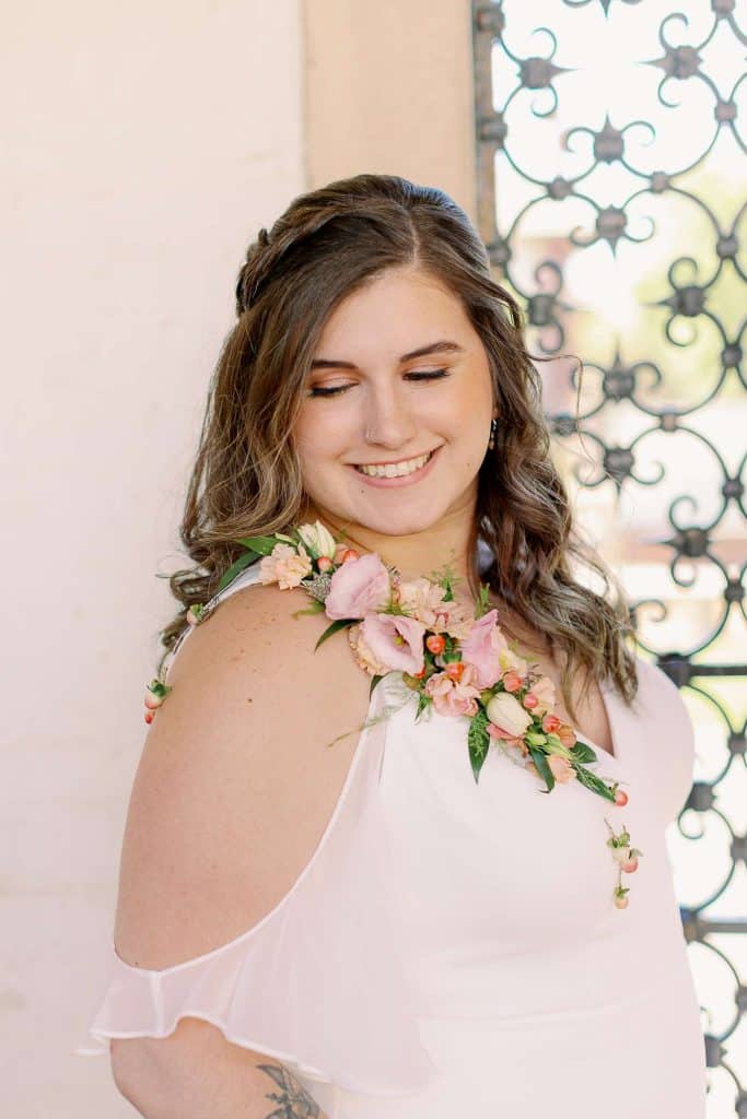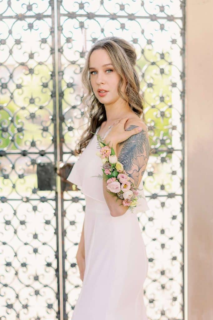 This arm band design used custom wire that wrapped the delicate flowers up the attendant’s upper arm.
