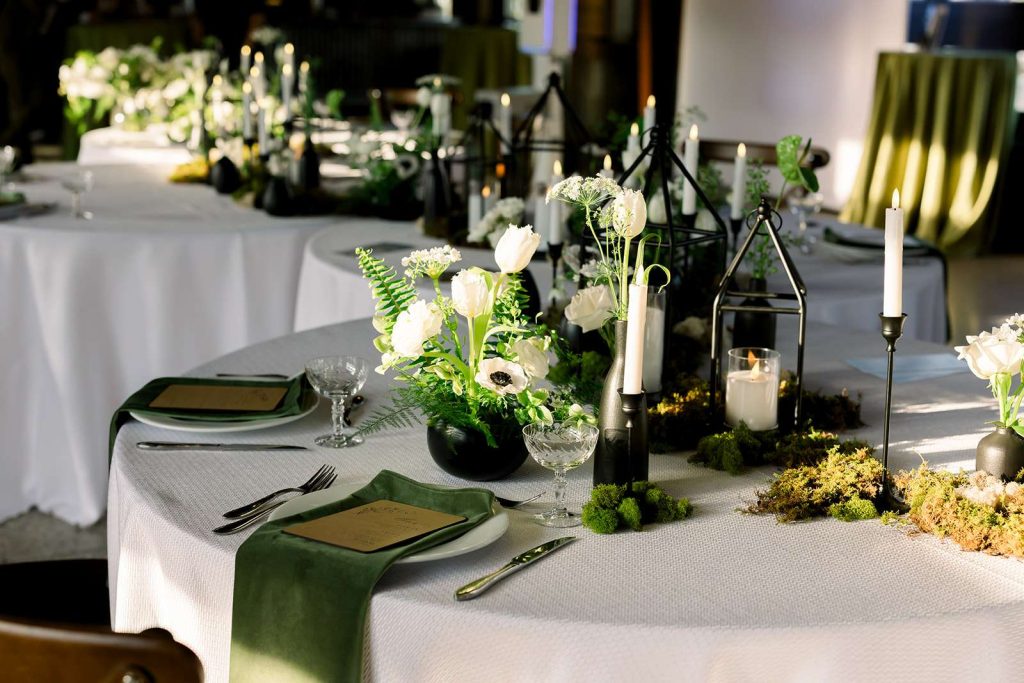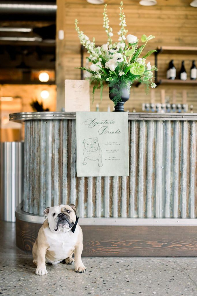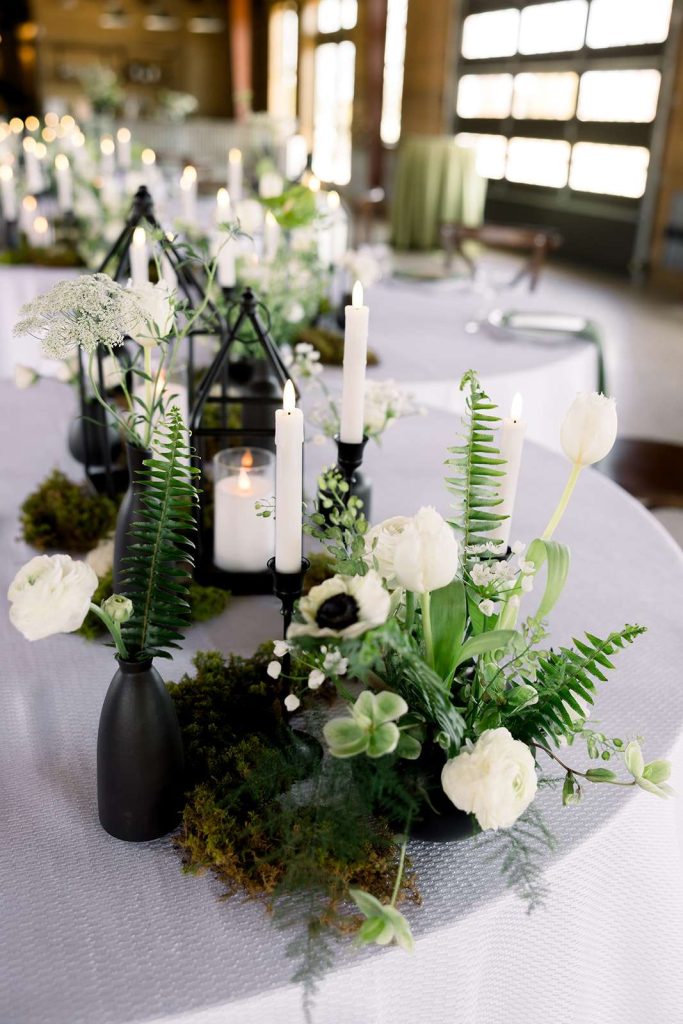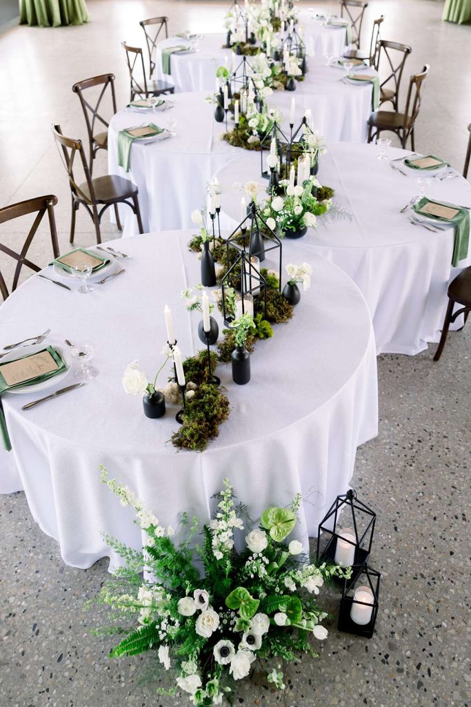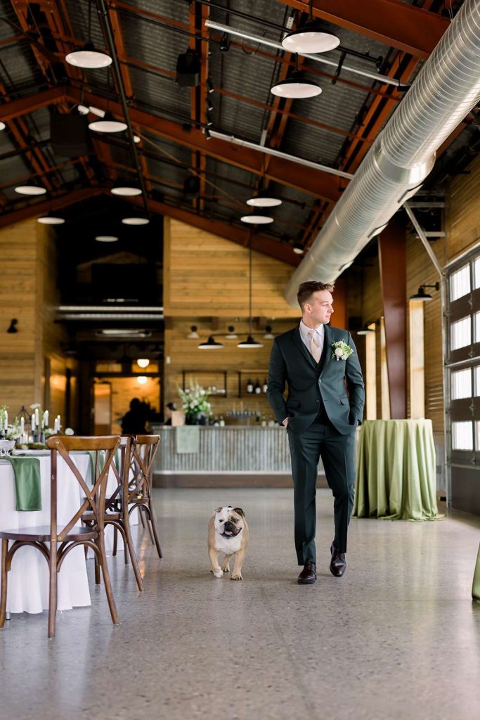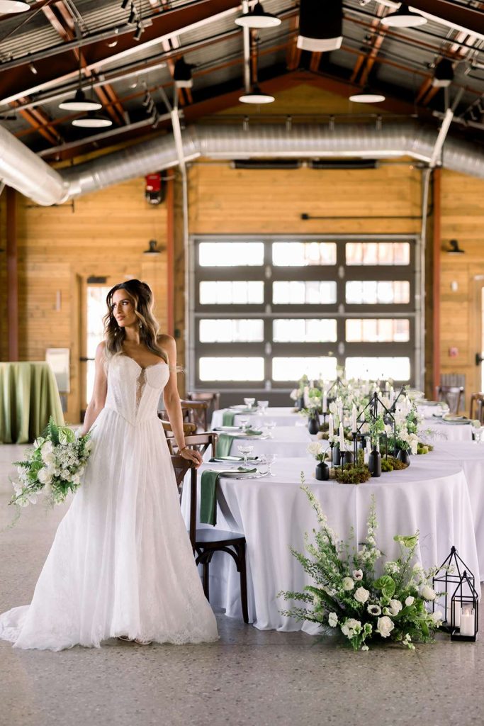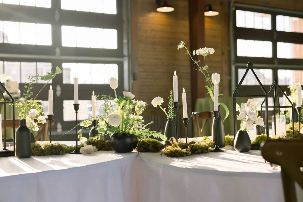 The first scene unfolded inside Foxtown Station, where a timeless palette of black, green, and white set the tone for sophisticated romance. Lush flowers from Reflections of You included white blooms with bold greenery and black accents for the overall aesthetic. Florals were a focus as they spread across tables draped with crisp white linens. The space was a perfect backdrop with garage doors for light all around and a sweet furry friend from, Piccola Pups.