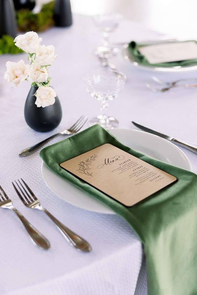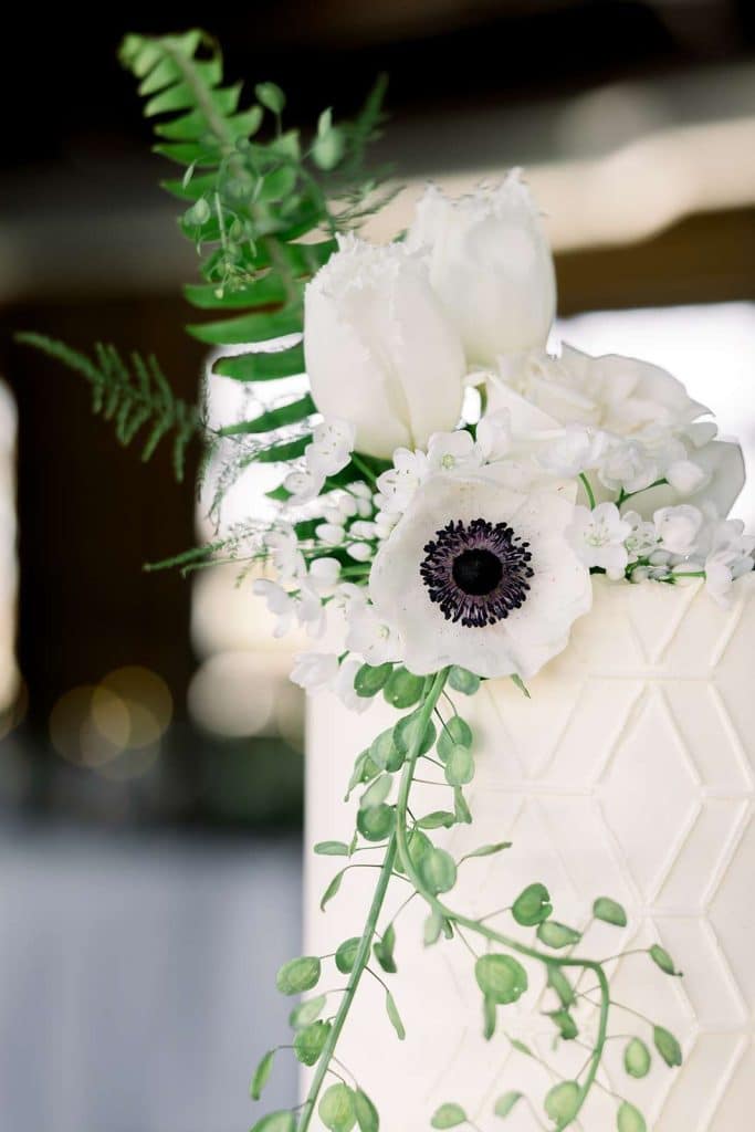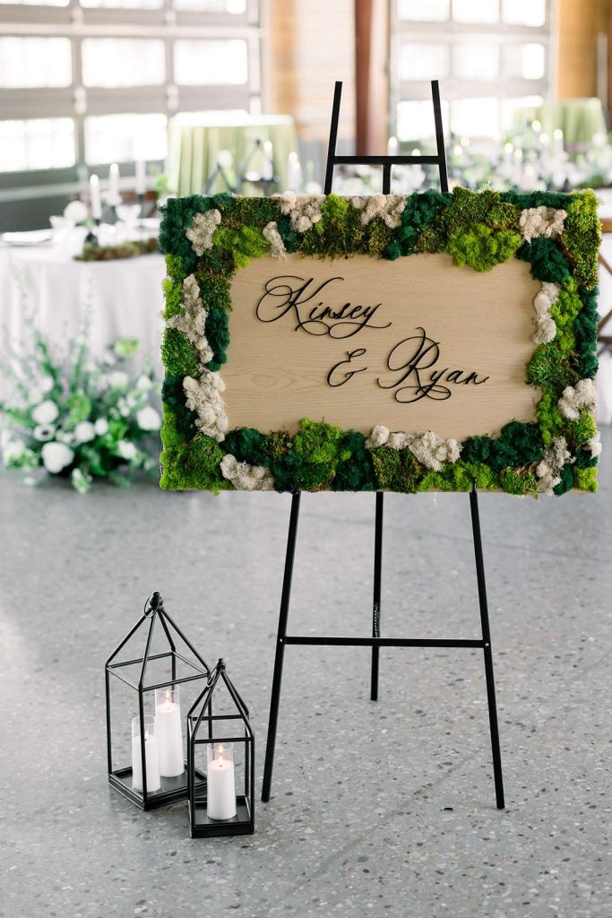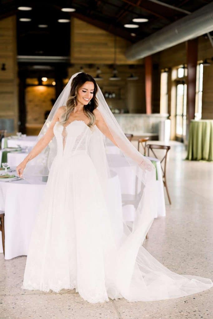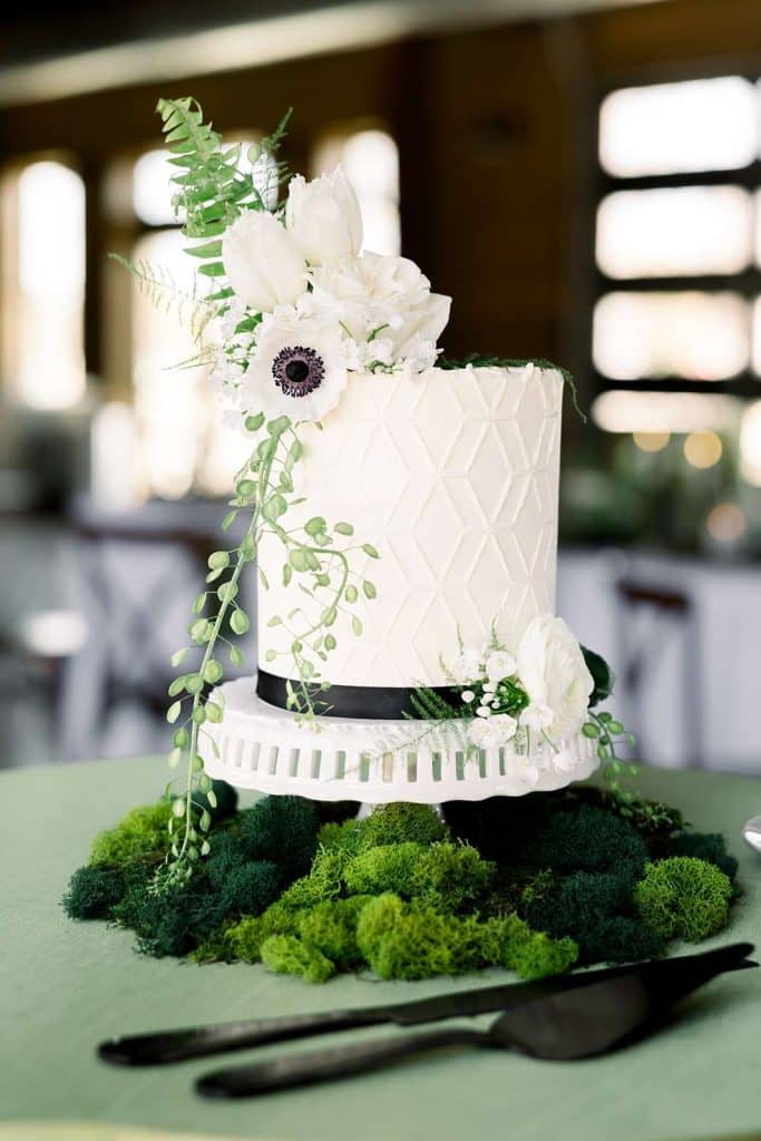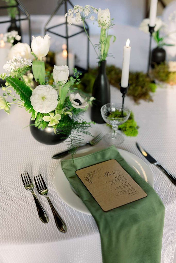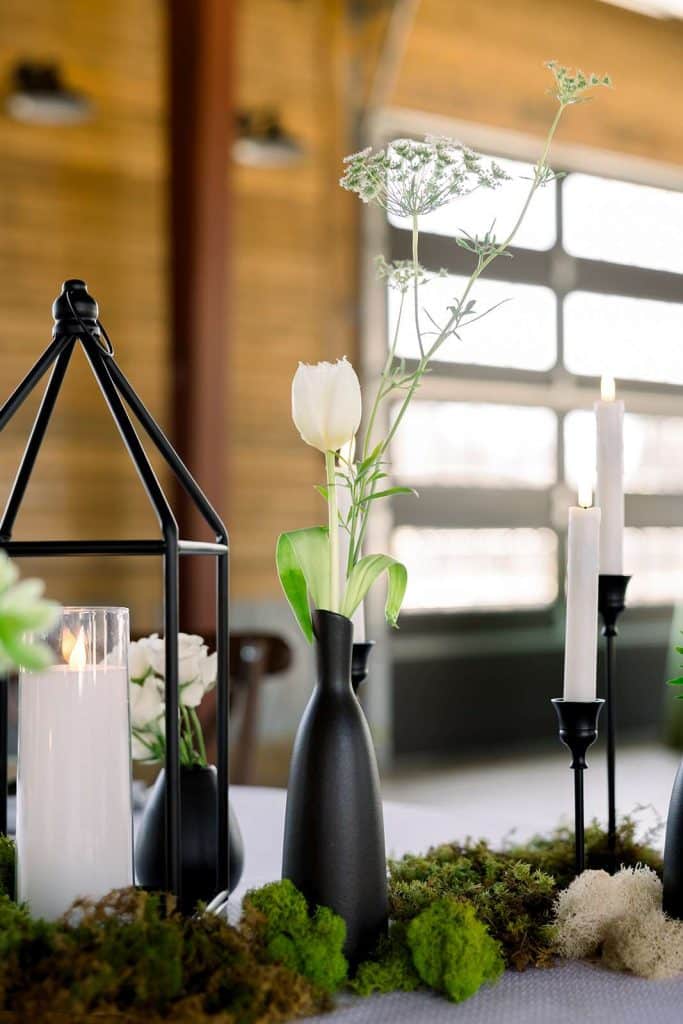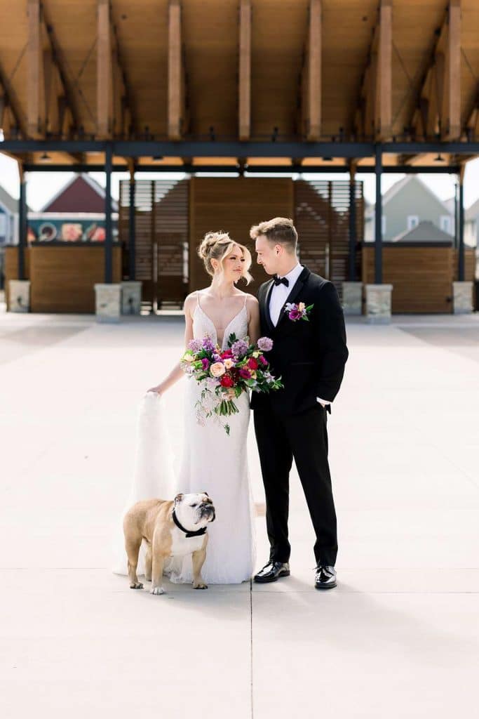 The first scene unfolded inside Foxtown Station, where a timeless palette of black, green, and white set the tone for sophisticated romance. Lush flowers from Reflections of You included white blooms with bold greenery and black accents for the overall aesthetic. Florals were a focus as they spread across tables draped with crisp white linens. The space was a perfect backdrop with garage doors for light all around and a sweet furry friend from, Piccola Pups.