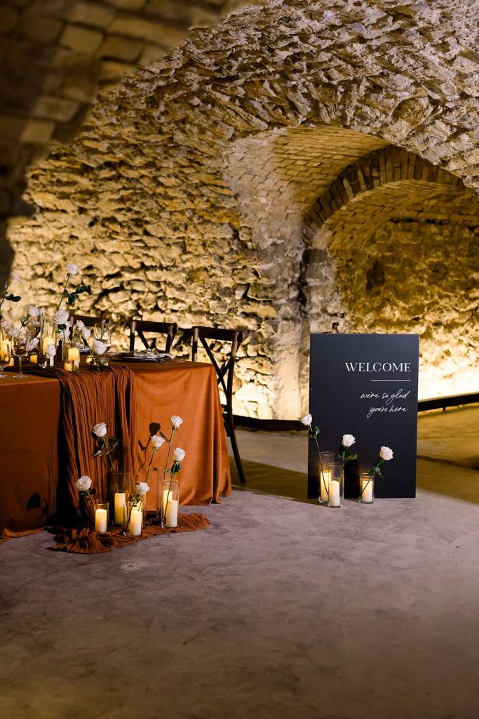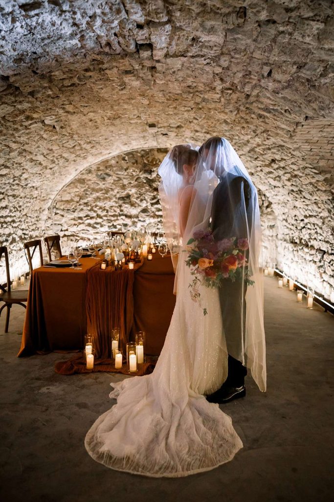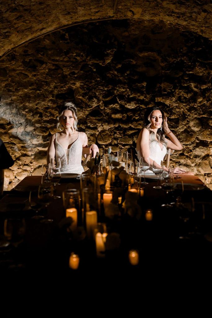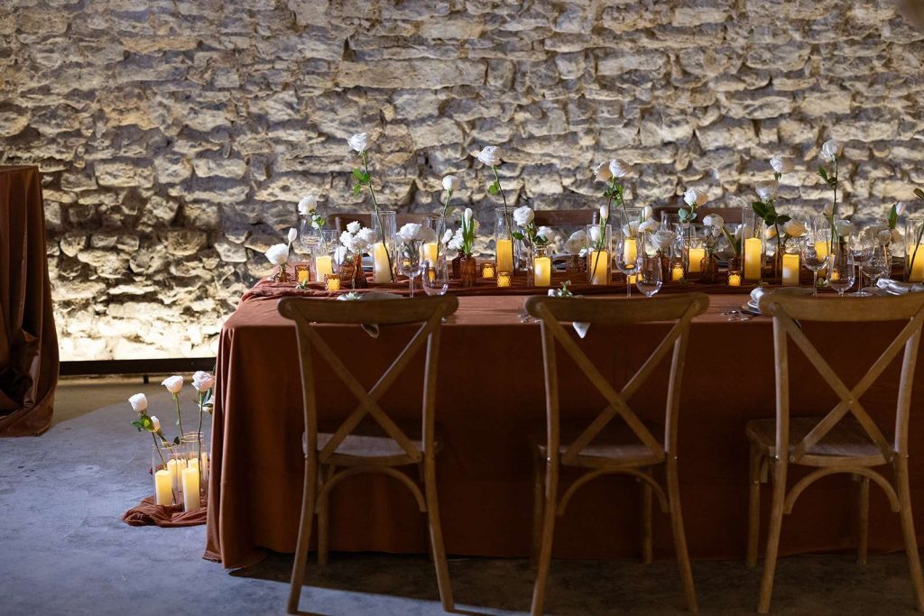 Next, the team ventured into the historic Foxtown Brewing Caves, where flickering candlelight and rich, warm tones created a moody, intimate atmosphere. The stone walls glowed in the warm light, highlighting single stem bud vases and rust linens. With a nod to old-world charm, the setting was perfect for couples seeking a deeply romantic celebration. Gowns and menswear from Bliss Bridal and DuBois Formalwear.