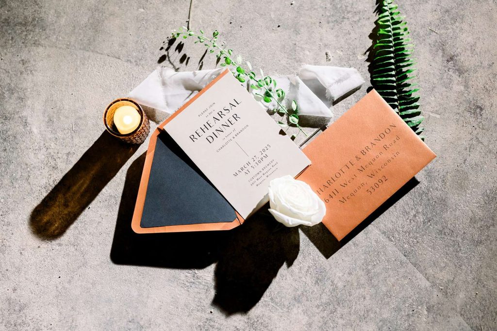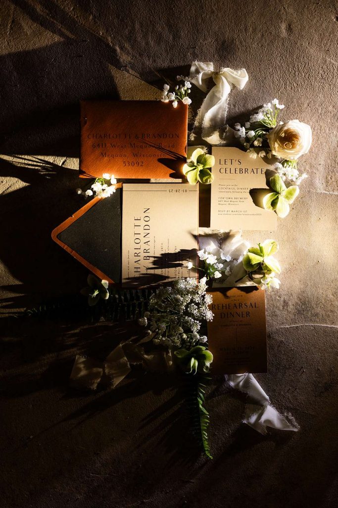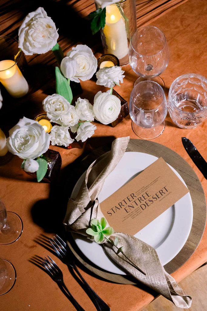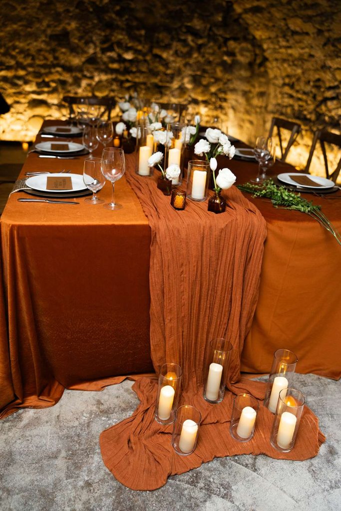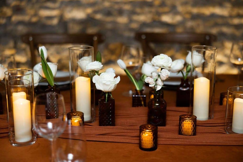 Next, the team ventured into the historic Foxtown Brewing Caves, where flickering candlelight and rich, warm tones created a moody, intimate atmosphere. The stone walls glowed in the warm light, highlighting single stem bud vases and rust linens. With a nod to old-world charm, the setting was perfect for couples seeking a deeply romantic celebration. Gowns and menswear from Bliss Bridal and DuBois Formalwear.