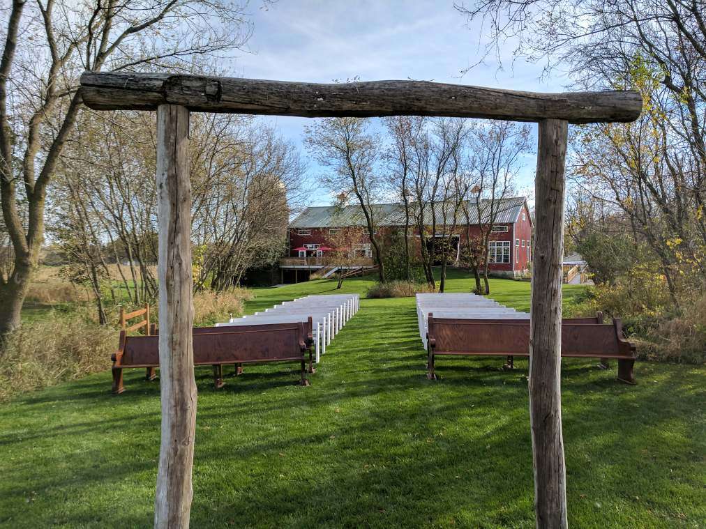 Say your “I Do’s” at the outdoor ceremony space complete with rustic wooden benches and church pews for guest seating.