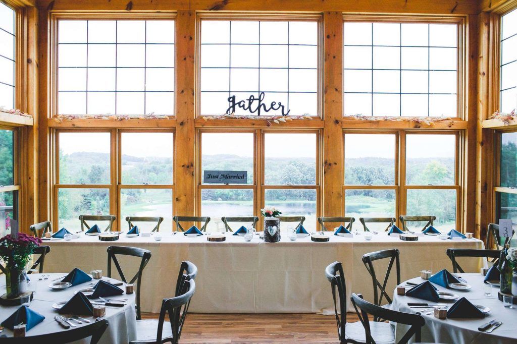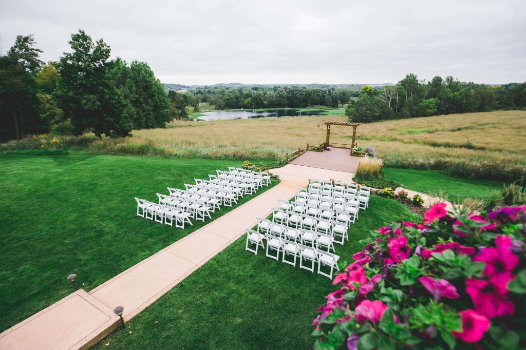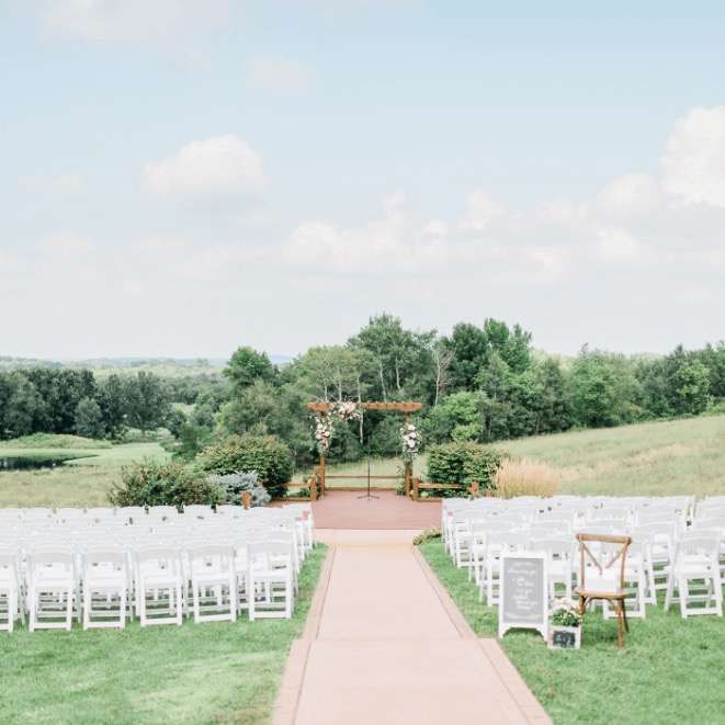 Weddings at Milford Hills are all-inclusive, making for stress-free planning. Ceremonies can be hosted in or out-of-doors, if the Wisconsin weather permits. Even receptions can be tented and outdoors if you have too many guests for the Clubhouse to accommodate. The Clubhouse sits on a hill overlooking the pond and gorgeous grounds, plus comes complete with two fireplaces and ample outdoor deck space. The Hideaway is a more intimate space with just as much charm.