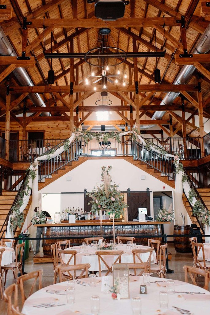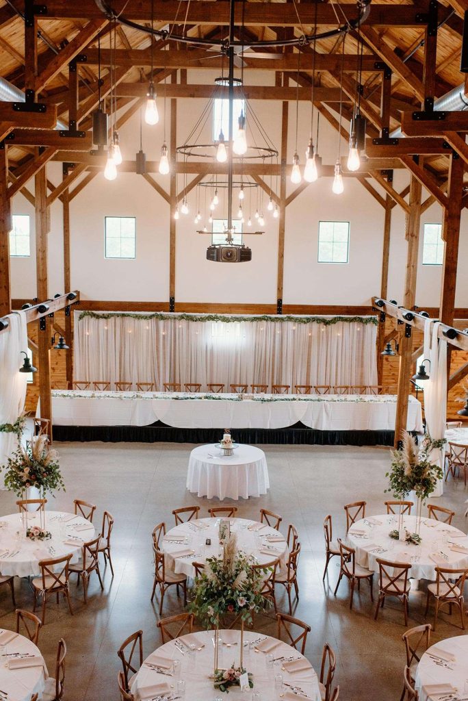 Host your ceremony and reception in the spacious modern barn under the vaulted ceilings with exposed beams. The loft area features a private bridal suite and lounge. Your guests will enjoy the covered patio, fire pit, and exterior deck and the sweeping views they offer.