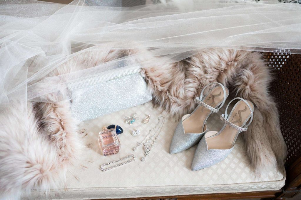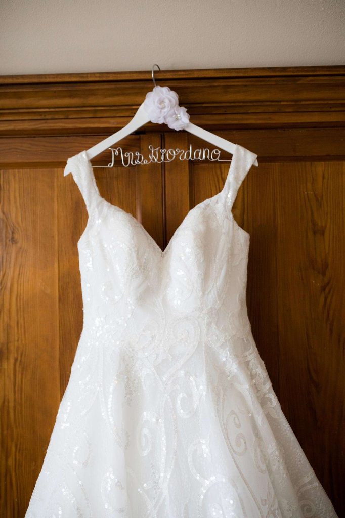 Karrie found her dress at Amelishan Bridal. She had tried on about five dresses and almost didn’t try on the gown that ended up being the one. “It was the last one, and on the hanger, it didn’t ‘show’ very well. But my sister was in the fitting room helping me, and she said ‘Hey, why not try it on—it’s here!’ The dress fit like a glove. It was perfect for winter, full of sequins and sparkle, and it twirled like a dream. The layers of fabric gave off the illusion of snow. I cried—we all did! I knew then that I was taking the dress home.”