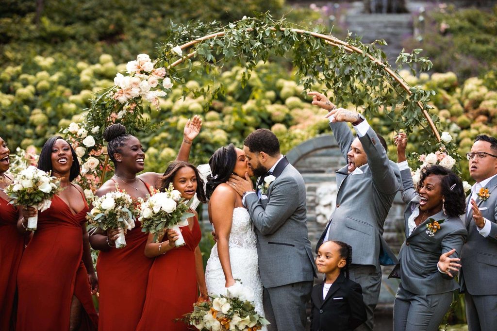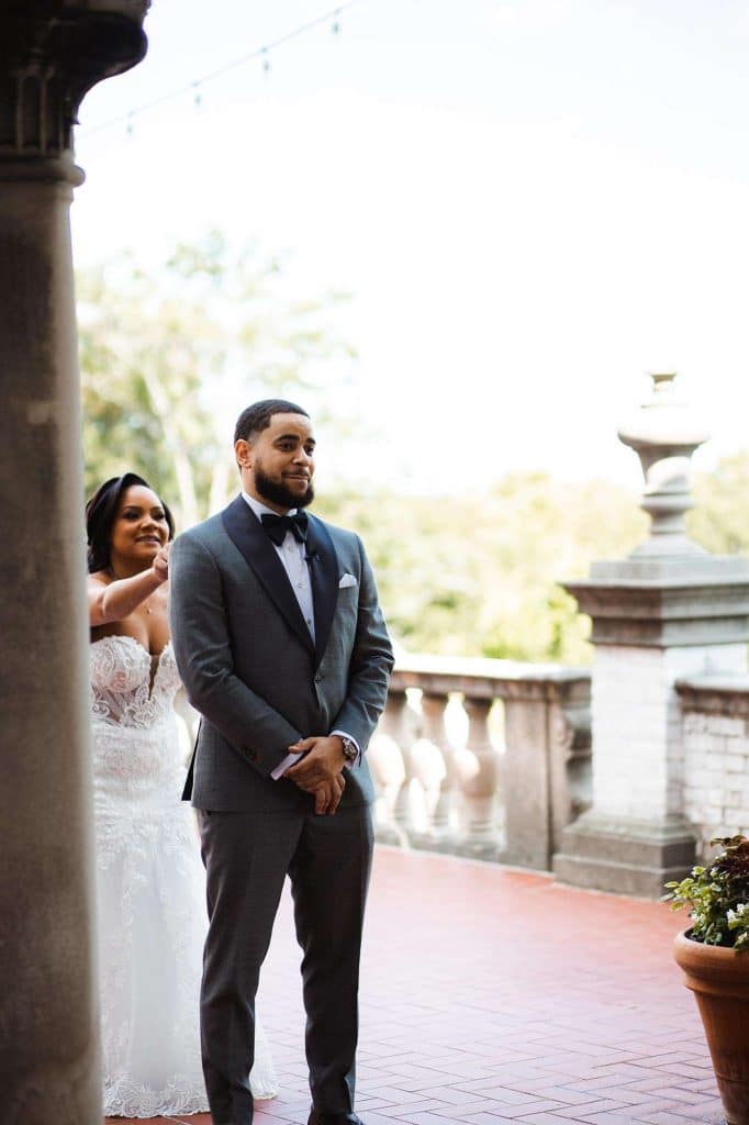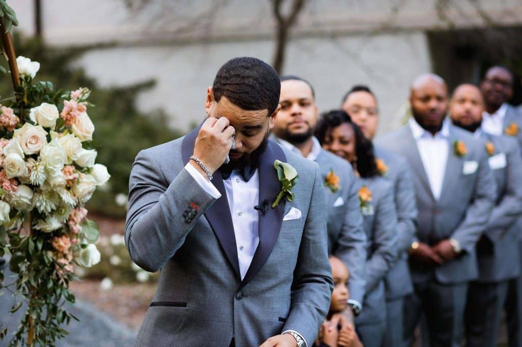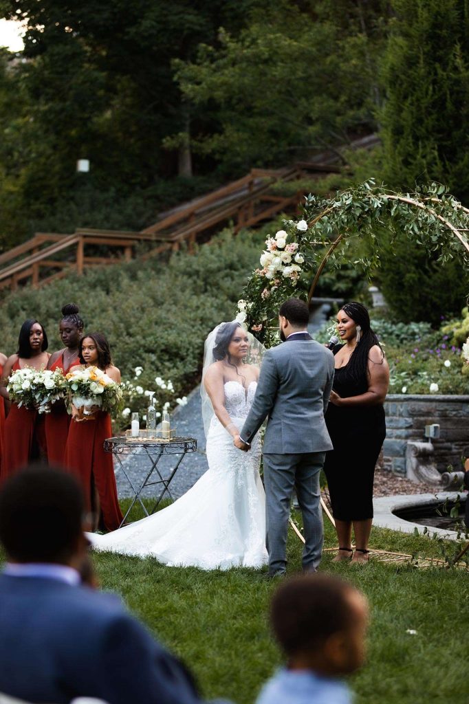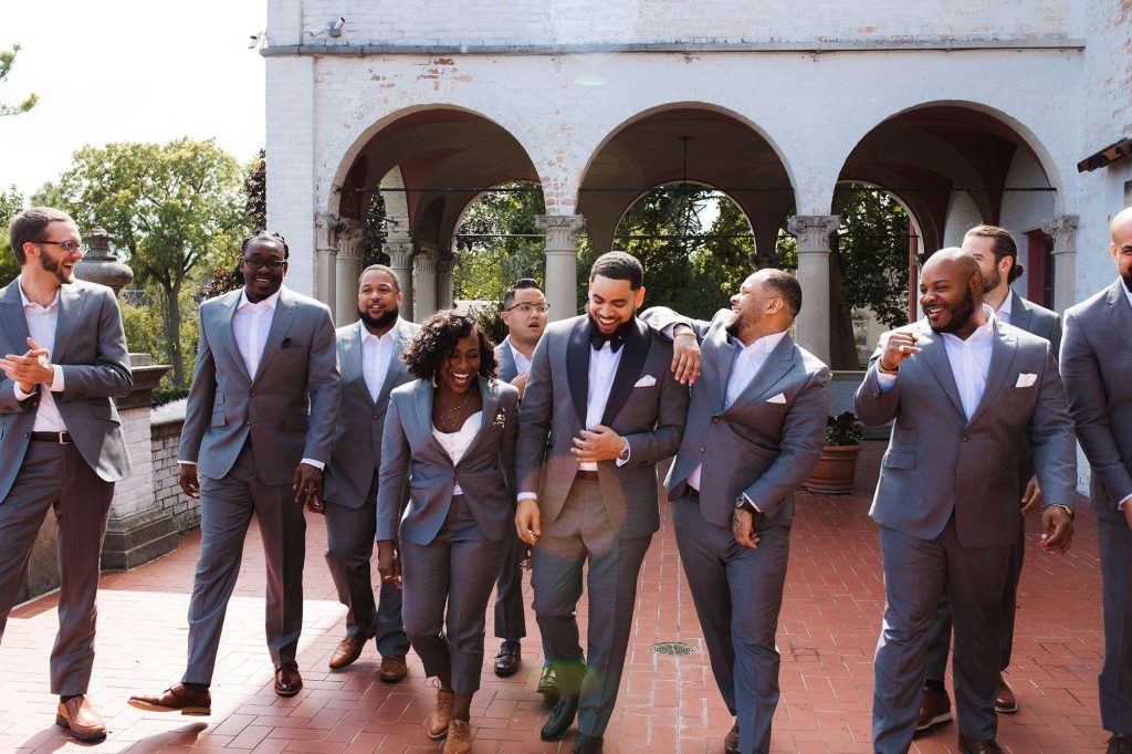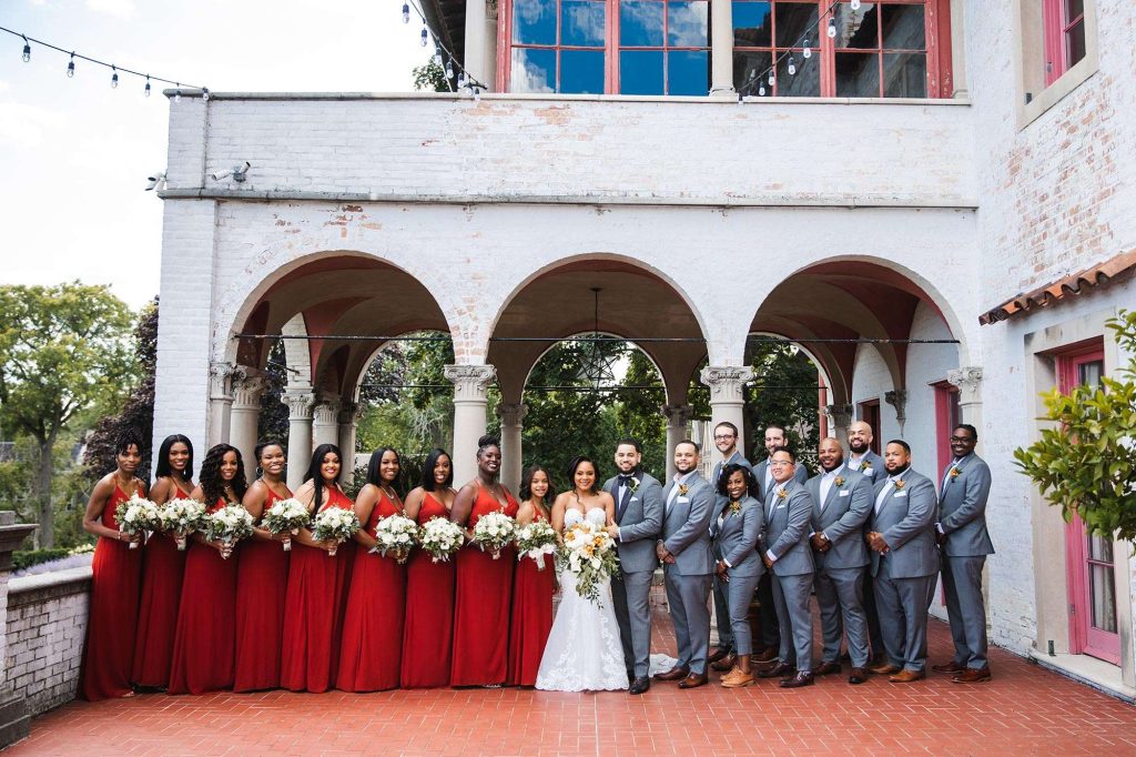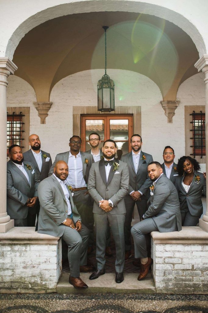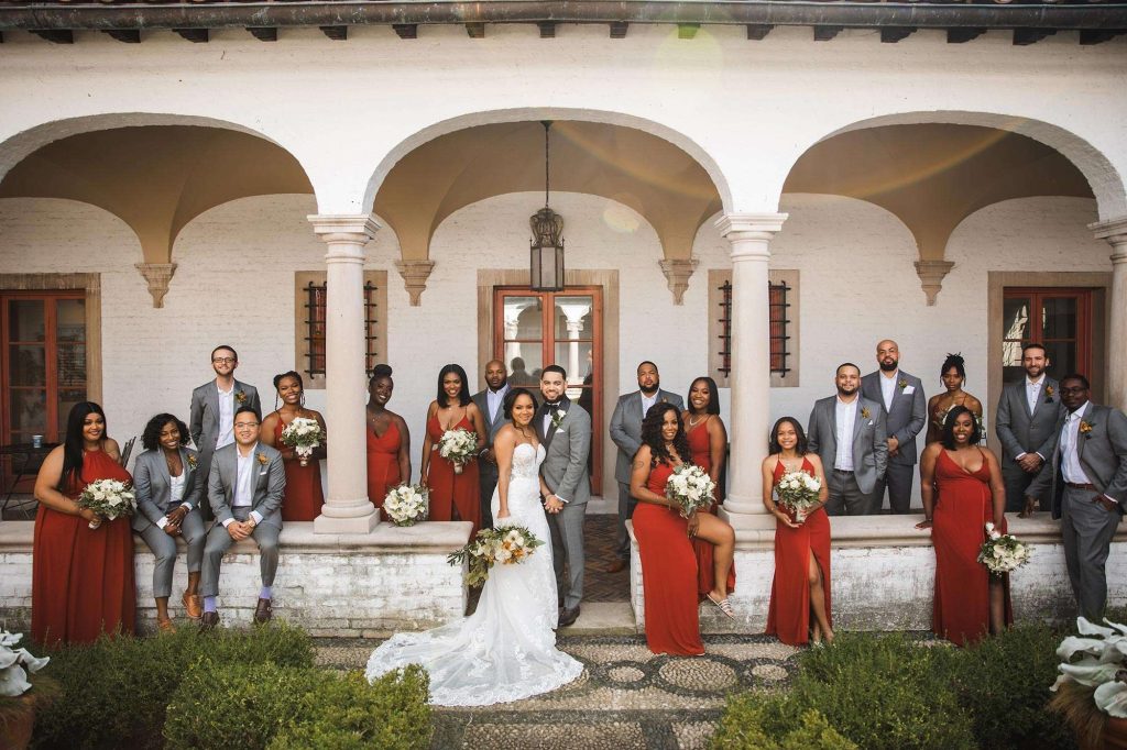 Before finding her Essence of Australia wedding gown, Yolanda tried on about 10 dresses. “I knew my dress immediately when I put it on. It fit like a glove, hugging all my curves. It was completely my style and everyone watching me try on dresses knew this was the one. I didn’t want to take it off.” After finding her dress, she landed on bridesmaid dresses from Savvy Bride in Brookfield. The color palette was grey and burnt orange with an overall modern-Mediterranean theme.